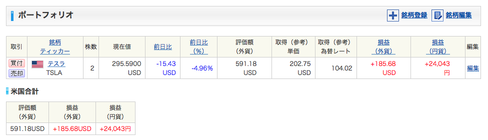 これは、私が唯一購入していたテスラという会社の株式です。イーロン・マスクという凄腕起業家が好きで応援するつもりで購入してみました。(約50,000円分)ずっと放置しているくらいが良いんですよね。
